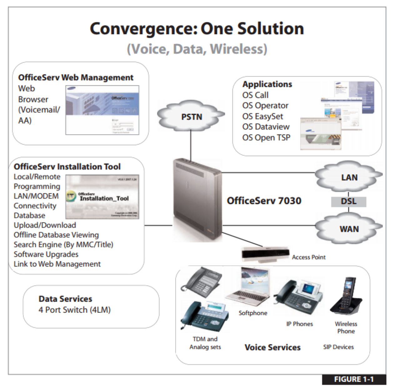 The OfficeServ 7030 design allows great flexibility and easily integrates into any business environment. With a single cabinet providing 2 universal card slots it allows connection to the public telephone network or private networks using analog circuits. The OfficeServe 7030 has a variety of interface cards allowing you to connect Proprietary digital phones, or IP terminals using the latest Voice over Internet Protocol (VoIP) technology which can be deployed over LANS or WANS. The OfficeServ 7030 platform supports industry standard Voice over Internet Protocol (VOIP), Session Initiation Protocol(SIP) as well as the more robust Telephony over IP (ToIP).